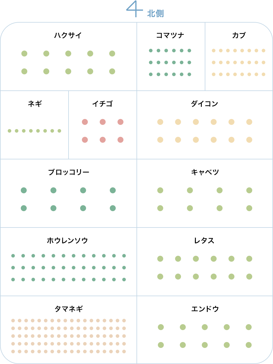 鍋物や漬物向きの野菜を中心にたっぷり楽しめます。秋冬野菜はアブラナ科が多いので、できるだけまとめて配置。冬は野菜の成長がゆっくりで、畑で長く保存できます。必要な分だけ収穫しながら年明けまで長く楽しめます。