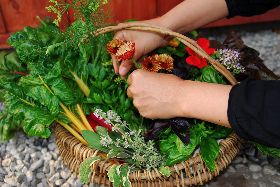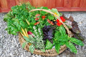 ツルで編んだ手づくりのカゴに収穫しました。見た目も美しく食べても美味しいキッチンガーデン詰め合わせセットの完成です。食べるのがもったいなくなってしまいますね。