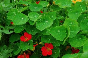 お肉料理に合うセイジとナスタチウム。ナスタチウムの葉は、ワサビのような苦みがあってお花も一緒にサラダに混ぜて食べられます。