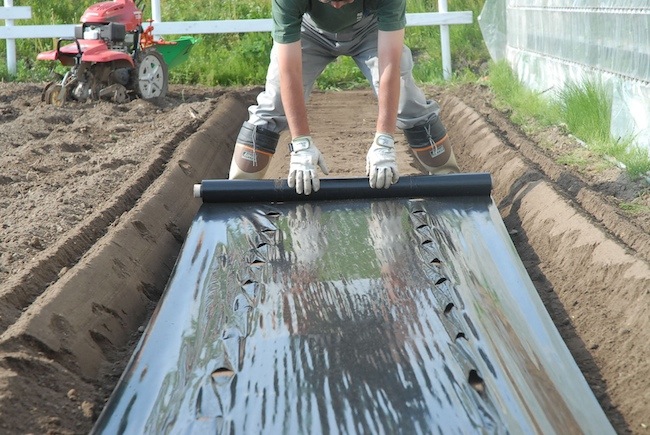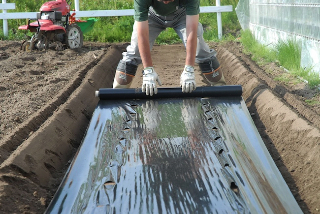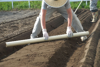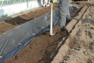 マルチは、95cm幅でトウモロコシに適した孔の空いている有孔マルチ、黒を使用しました。マルチの役割としては、地温を高め、降雨によって地表面が固結することや、肥料の流亡を防ぎ、黒色フィルムを用いれば雑草よけ、果実へ土のはね上がりも防げるなど、様々な効果を得る事ができ便利です。