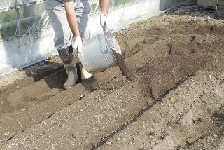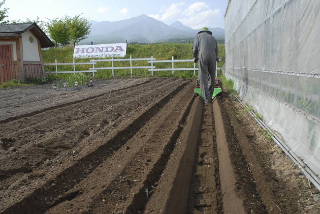 マルチをしてしまうと追肥ができなくなるので、その前に株間に肥料をまき、クワで軽く中耕して土と混ぜておくことが大切です。 |
