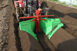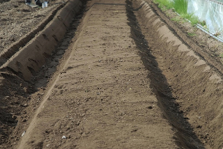 マルチの幅に合わせ外側に土をよせながら畝を作ります。 |