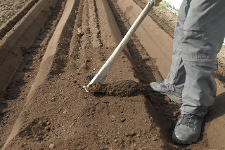 | あらかじめ綱をはって直線を出し足跡をつけてか土寄せするとまっすぐ、きれいな畝が作れます。 |