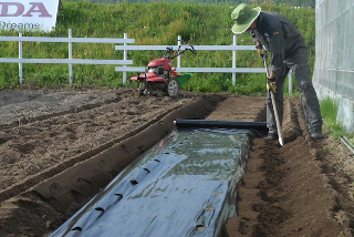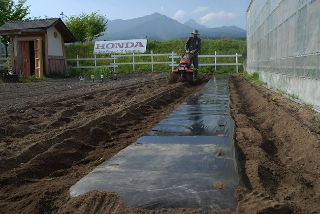 トウモロコシをまくため、畝を作りポリマルチをはりました。